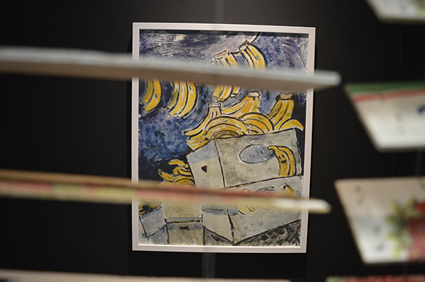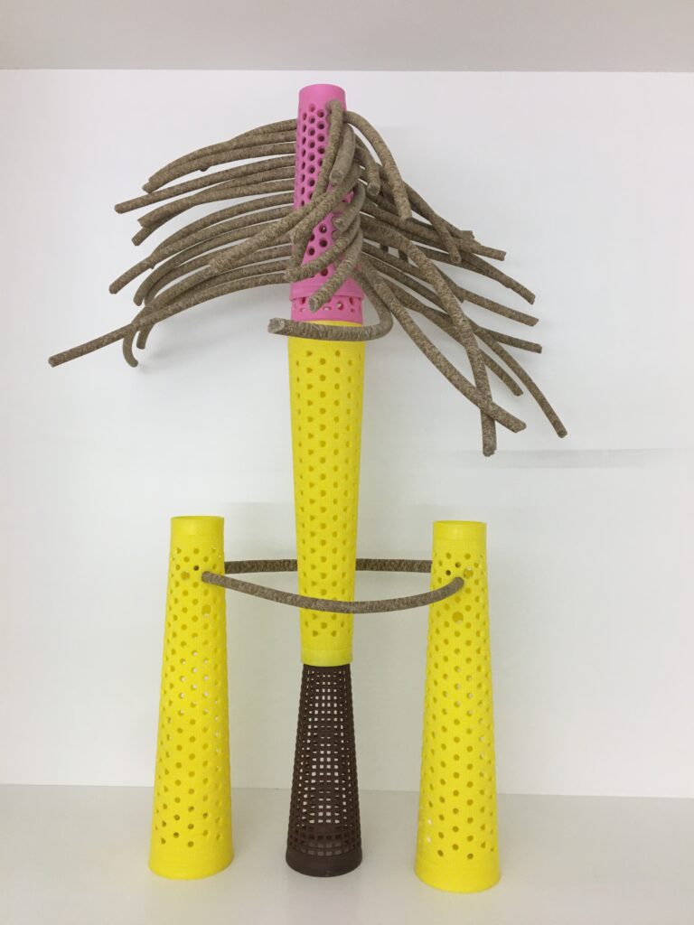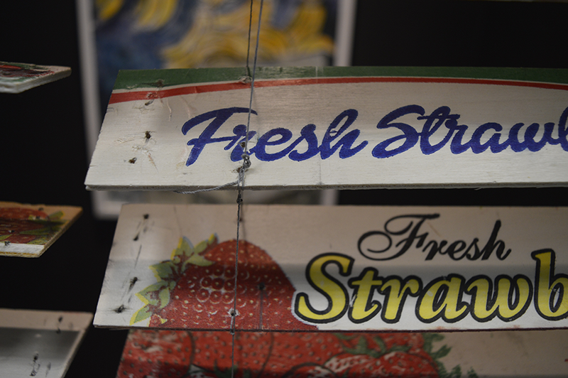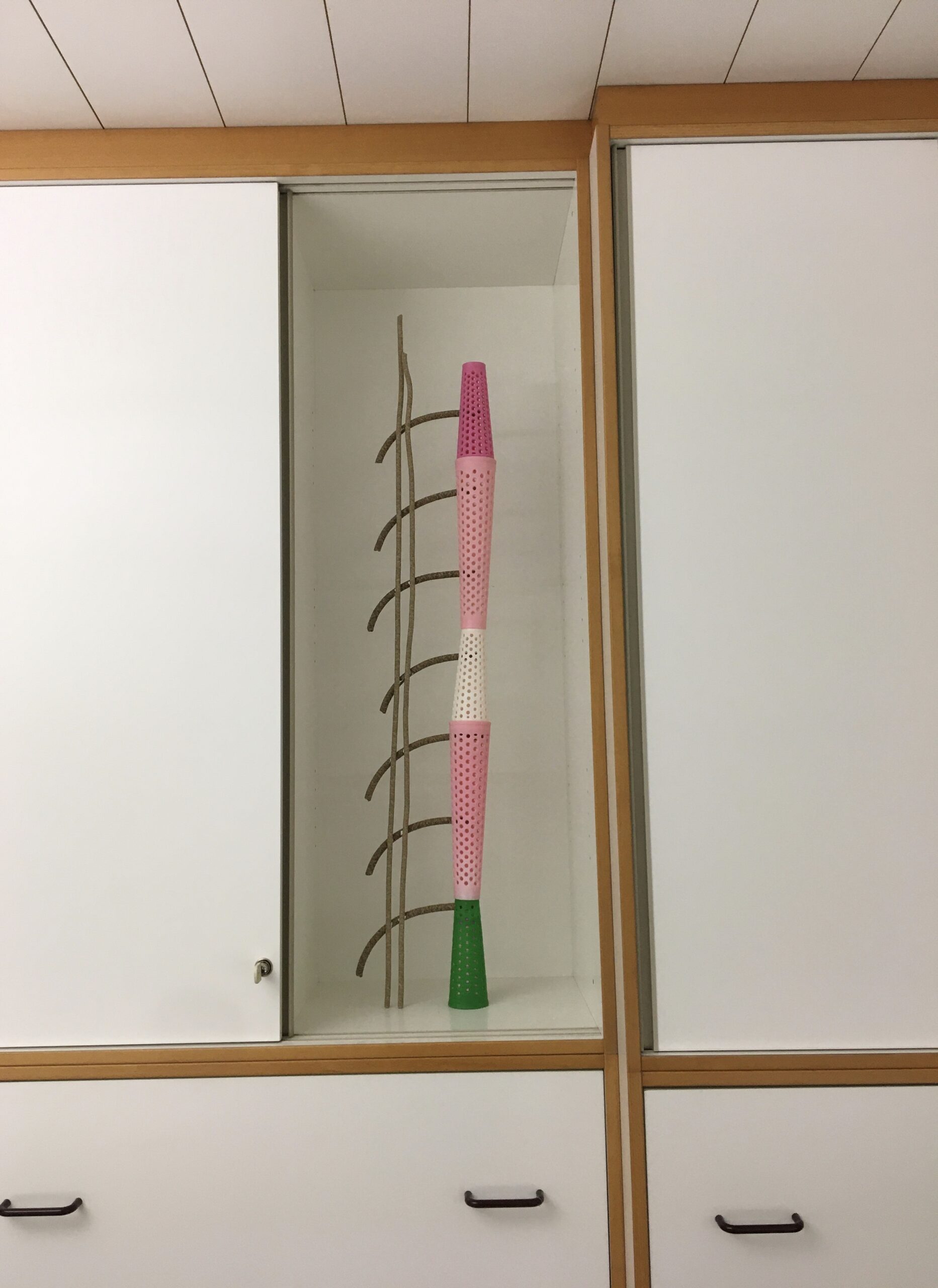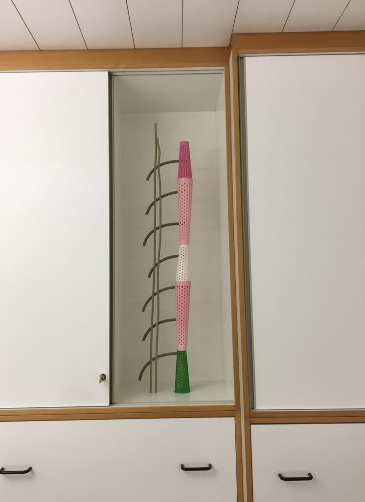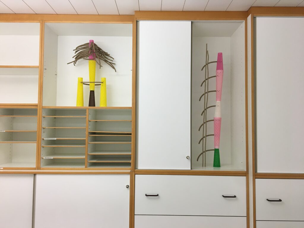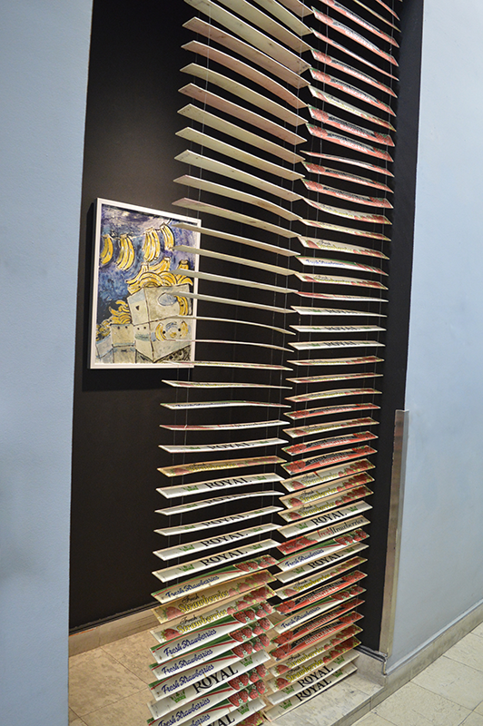 ist eine Arbeit, die vom Frauenmarkt in Sofia inspiriert ist. Ihr kauft dort Obst, Gemüse und so Vieles. Der Markt hat einen Tagesablauf und jeder tut, was er zu tun hat. So, nachdem der Müll weg ist, kehrt Ruhe ein. Die Jalousien sind unten. Hinter meinen hängt die Arbeit von Petra Dimitrova, die mit mir die Faszination für diesem Ort teilt. Die vielen auseinandergebauten Erdbeerschachteln sind fragil zu zwei vorhängenden Objekten geworden.