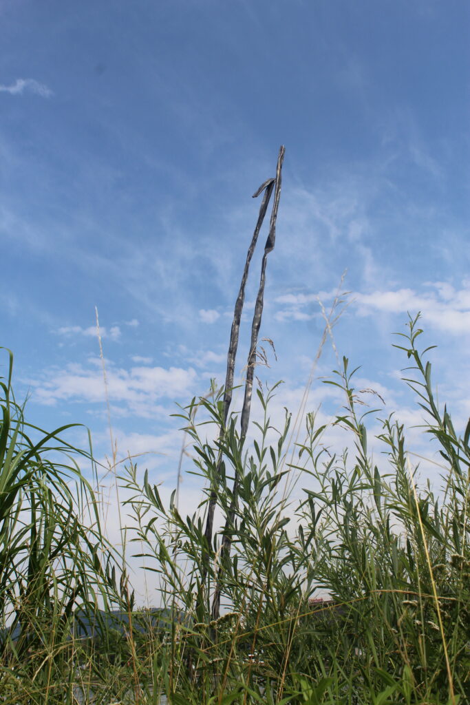 Die Arbeit Halme ist an der Stadtwerkstatt-Donaulände zu sehen und ist mit dem Text, der in der Referentin publiziert wurde, zu verstehen: Man liest im Text und es kommen immer wieder die zwei Stangen vor. Ist man mit dem Text fertig, legt man ihn zur Seite. Die Tage darauf geht man in Linz an der Donau spazieren und kommt an meinen Halmen vorbei. Man wundert sich: Woher kenne ich die Halme? Habe ich davon geträumt? Oder was!?