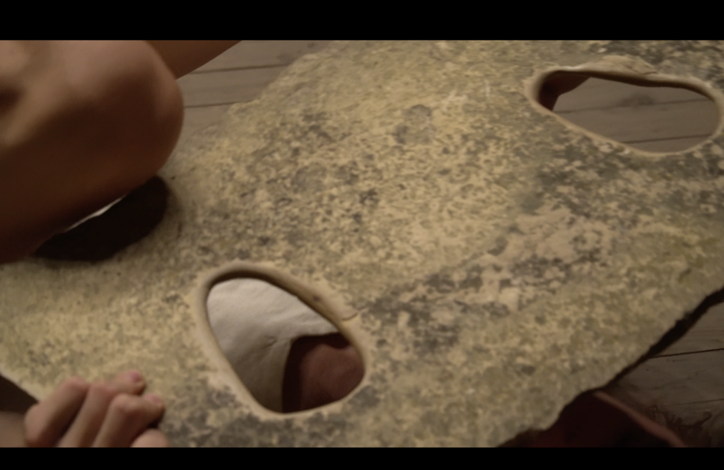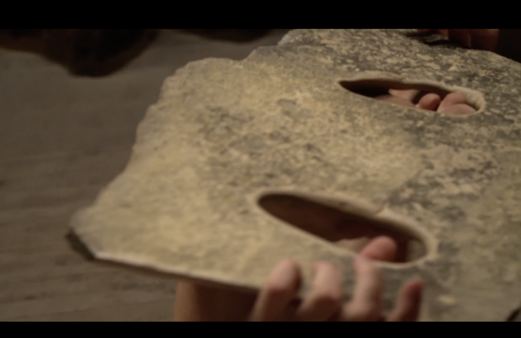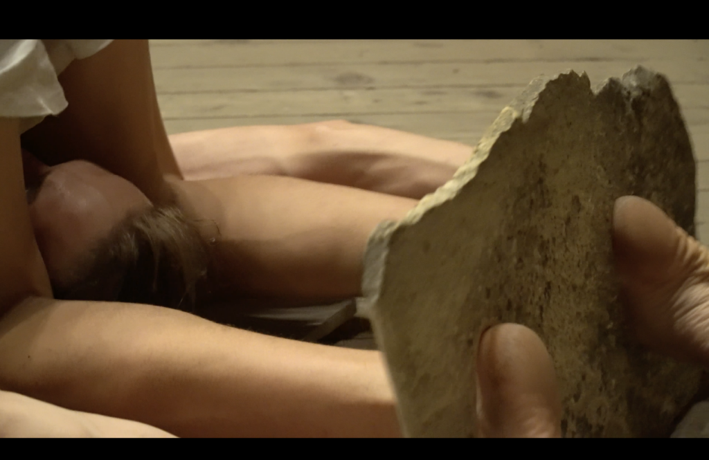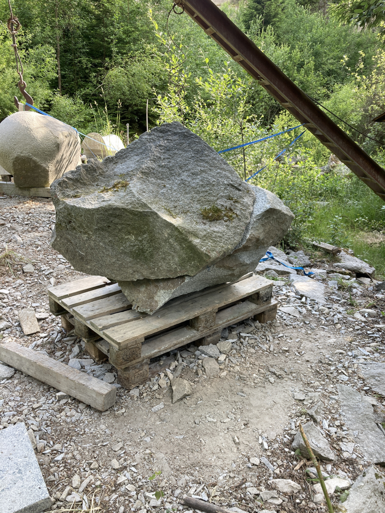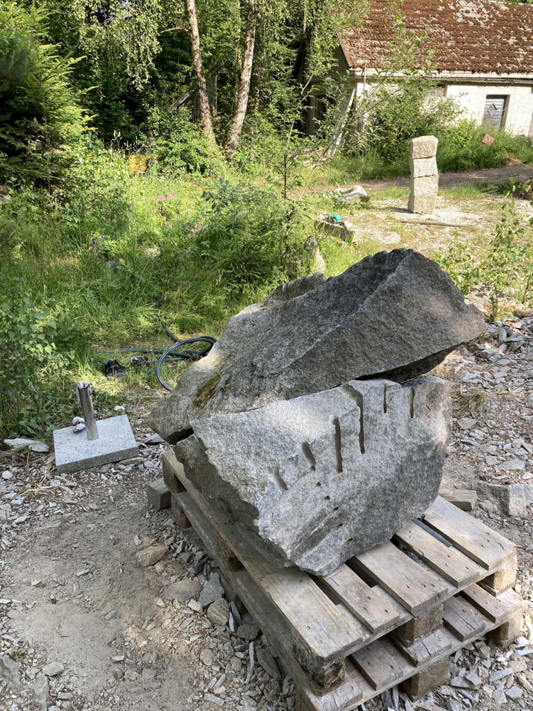 ist ein Werk, das aus zwei übereinander verweilenden pyramidenform ähnlichen Granitsteinen besteht, deren Innenseite so bearbeitet wurde, dass sie großteils platt aufeinanderliegen und dennoch Fugen sich bilden, in denen ihr die gespitzten Innenflächen erahnen könnt. Zwei färbige Markierungen, die im Arbeitsprozess entstanden sind, geben die Position wie Lea auf mir liegt preis. Sie ermöglichen es ihr, ihren Platz nach Bewegungen wiederzufinden. Die Außenseiten der beiden Steine wurden roh gelassen. Bohrlöcher, die beim Entnehmen des Steines aus dem Felsen entstanden sind, und Oberflächen zeigen die Bewegtheit des Steines auf.